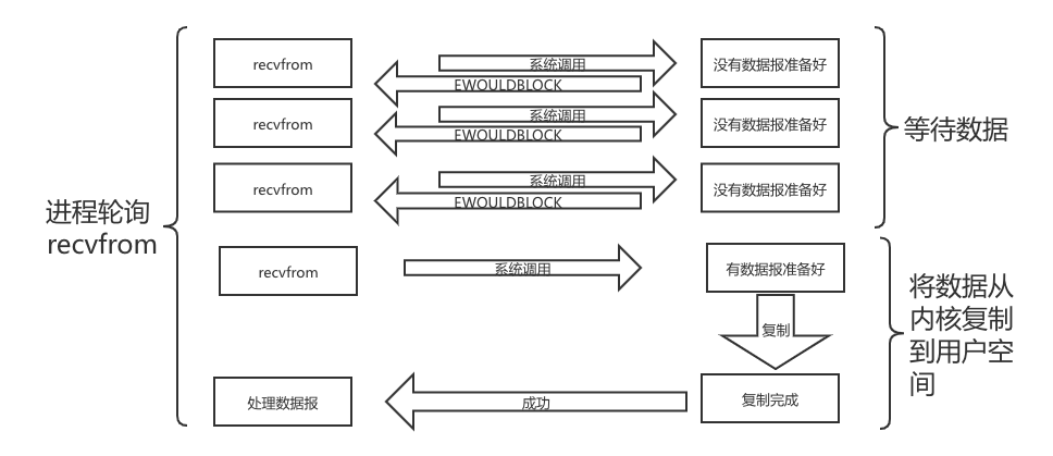recvfrom系统调用立即返回一个EWOULDBLOCK错误,即不会将用户进程(线程)置于阻塞状态。当内核中的数据报已经准备好时,此时