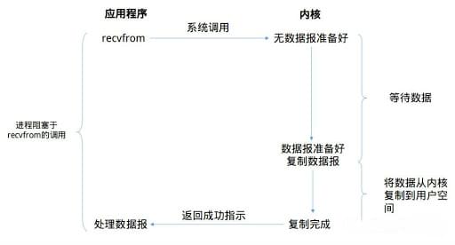 recvfrom系统调用,用户进程(线程)还是会阻塞,直到内核中的数据报已经拷贝到了用户空间,此时用户进程(线程)才会被唤醒来处理接收的数据报。